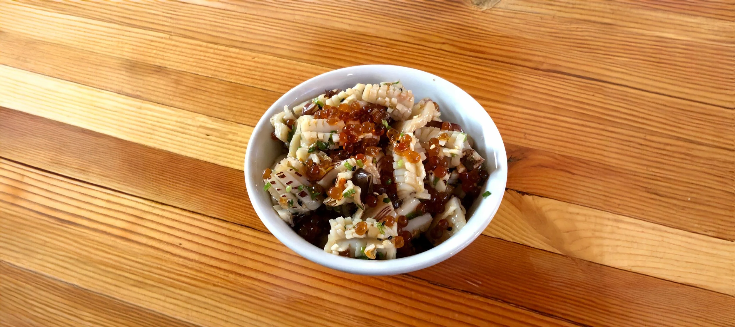5. Blanche squid by placing in an appropriate size colander and pouring boiling hot water over it until opaqueness disappears (about 5- 10 secs).
